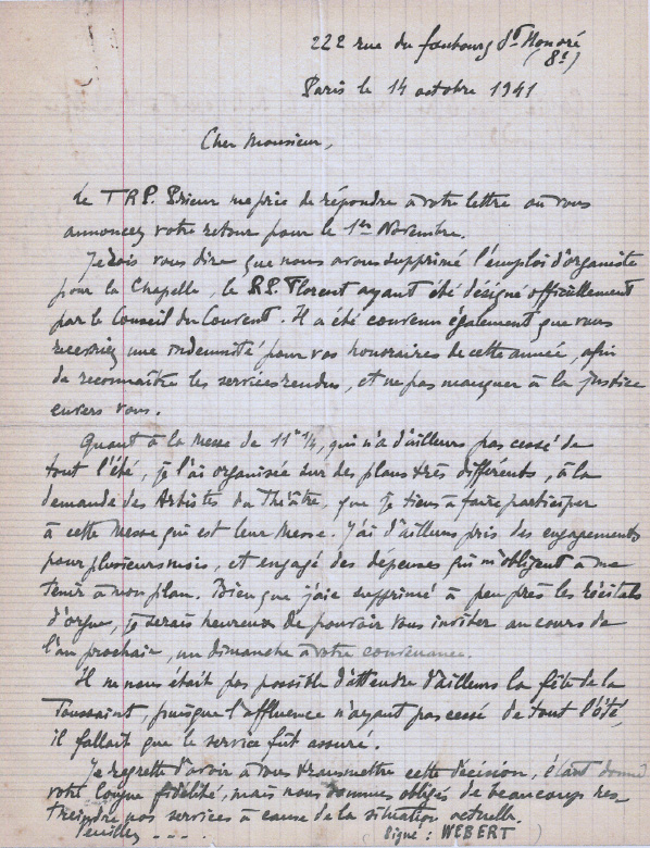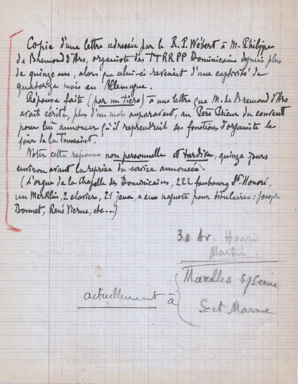 | Copie manuscrite par Philippe de Brémond d'Ars d'une lettre à lui adressée le 14 octobre 1941 par le R.P. Jourdain Wébert o. p. au nom du Supérieur de l'ordre des Dominicains lui annonçant, à son retour de captivité d'Allemagne, la suppression de son emploi d'organiste, remplacé par le R.P. François Florand. Au verso figurent des précisions à l'intention du destinataire, le secrétariat de l'Union des Maîtres de Chapelle et Organistes alors présidée par Henri Büsser, successeur de Widor. (coll. UMCO) DR. |