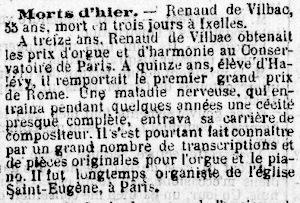 Le 3 février 1880 une catastrophe ferroviaire survenue dans la banlieue parisienne, à Clichy-Levallois, faisait 13 morts et une quarantaine de blessés. Plusieurs artistes figuraient parmi ces derniers : Mme Collin, femme du chanteur de l’Opéra-Comique et sœur de Melle Fiocre, de l’Opéra ; MM. Haymé et Joly, des Bouffes et Auguste Bazille, alors premier chef du chant à l’Opéra-comique, qui rejoignait son domicile, non loin de Paris, situé à Colombes. Quelque temps auparavant, le samedi 5 juin 1875, c’est lui qui avait joué les obsèques de Bizet aux claviers du grand-orgue de l’église de la Trinité, en improvisant pour cette occasion sur des thèmes des