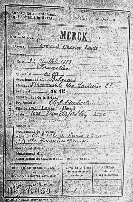 Livret militaire d'Armand Merck, 4e Bureau de recrutement de Paris, classe 1929, matricule 6050