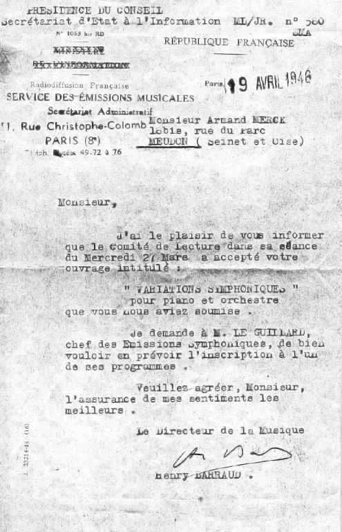 Lettre du 19 avril 1946 de Henry Barraud, Directeur de la musique